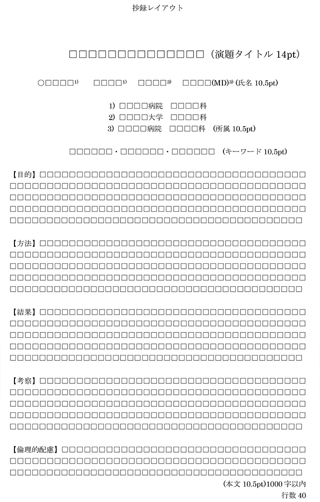 *キーワードは3つとし、区切りは中点「・」を記入して下さい。 *本文は1000字以内とし、10行目より始めて下さい。(字数には十分にご注意下さい) *句読点は「,」「.」に統一して下さい。 *字体はMS明朝、英・数字はCenturyを使用し10.5ptとして下さい。 *Microsoft Word2007(Windows)以降にて横書きで作成して下さい。 *倫理上の注意として、ヘルシンキ宣言に沿った研究であることを抄録内に明記して下さい。